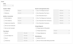 NOTA Los eventos de SLA y Aprobación de cambios solo desencadenarán una regla del flujo de trabajo si esas características están habilitadas. Consulte Introducción a la gestión de niveles de servicio y Administración de cambios para más información.