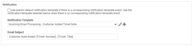 | Plantilla de notificación | Para usar una plantilla específica cuando se active esta regla del flujo de trabajo, selecciónela en el campo Plantilla de notificación. Haga clic en el ícono de edición NOTA Si la casilla de verificación sobre este campo está seleccionada y la regla del flujo de trabajo es activada por un evento que tiene un evento de plantilla de notificación correspondiente, se usará para la notificación la plantilla predeterminada asociada con ese evento de plantilla de notificación. |