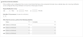 Si su regla del flujo de trabajo está configurada para activarse en uno o más Sección Eventos con un componente de tiempo (minutos, horas, días de calendario, etc.), se pueden configurar notificaciones recurrentes. Las notificaciones recurrentes solamente se activarán en eventos con componentes de tiempo, y las notificaciones se detendrán tan pronto como ya no se cumplan las condiciones de reglas del flujo de trabajo, por lo que los clientes no recibirán notificaciones luego de que hayan respondido.