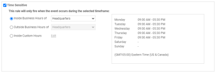 La sección Sujeto a limitación temporal le permite limitar cuándo se desencadenará la regla del flujo de trabajo. Esto es fabuloso para crear distintas reglas del flujo de trabajo para horas laborales y horas extra, o para asignar un ticket a un equipo en otra zona horaria si tiene un modelo de soporte de 24 horas al día.![]()