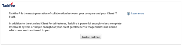 Para establecer su cliente con su propio servicio de asistencia interno, haga clic en Habilitar Taskfire. Consulte Configurar Taskfire para un cliente.![]()