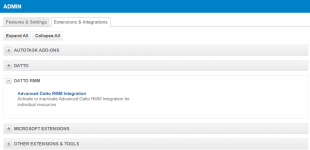 Navegue al Menú de Navegación Izquierdo > Admin > Categorías de Admin > Extensiones e Integraciones > Datto RMM y haga clic en Integración Avanzada de Datto RMM.