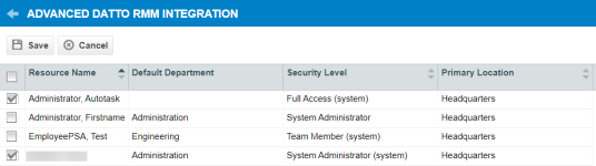 Después de habilitar la integración de Autotask en RMM, tendrá que conceder acceso a la integración a sus recursos de Autotask de forma individual. Usted puede gestionar estos permisos en la página Integración Datto RMM avanzada. Para abrir la página, use la(s) ruta(s) de acceso en la sección Seguridad y navegación más arriba.
