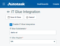 - Administrators can connect and disconnect their organization's Autotask instance from their instance of IT Glue. Refer to Integration setup.