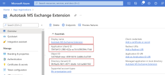 - Justo debajo del nombre de visualización, verá el Id. de aplicación (cliente) y el Id. del directorio (inquilino). Copie estas cadenas en una nota para pegarlas en la página Configuración de MS Exchange de Autotask. Consulte Pegar las credenciales de sincronización en Autotask.
