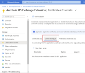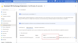 - Copie el valor secreto del cliente en una nota para pegarlo en la página de configuración de la extensión de MS Exchange de Autotask. Consulte Pegar las credenciales de sincronización en Autotask.