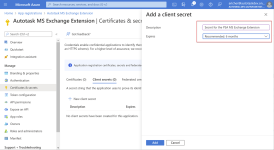 - En el campo Expira, seleccione el marco de tiempo por el que será válido este secreto. Sea cual sea la duración que elija, ponga un recordatorio en su calendario para generar un nuevo secreto y póngalo en la página de configuración de Autotask MS Exchange antes de que expire.
