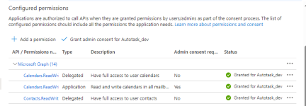 | Calendars.ReadWrite | Permite a la aplicación crear, leer, actualizar y eliminar eventos en los calendarios de los usuarios. |