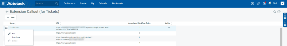 - La tabla muestra los nombres de todas las llamadas de extensión, las URL a las que se envían los datos, el número de reglas de flujo de trabajo asociadas y si la llamada está actualmente activa.