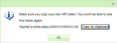 - Haga clic en Guardar. El token se crea y se muestra esta vez. Una vez que haga clic en Aceptar, no podrá volver a la ventana de diálogo.