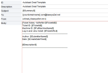 | Cuerpo: | [Notas del ticket ~ticRefId='[$Id.deTicket$]'] Id. de ticket: [$Id.deTicket$] Id. de equipo: [$NombreCompletodelEquipo$] Iniciar sesión y ver ticket: [$URLdeTicket$] ---------------------------------------- Autor: [$NombredelRemitente$] Fecha: [$FechayHoradeCreación$] [$Descripción$] ------------------------------------------ |
